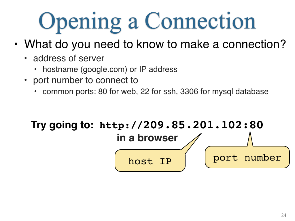 - We need to use a port number in addition to the name/address because each computer typically only has one IP address, but it might need to run many different servers on it at the same time.